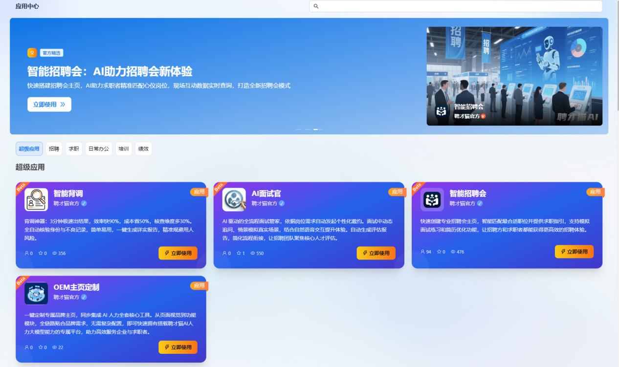 随着人社部《数字技术赋能人力资源服务业行动方案》落地,“AI+招聘”被写入产业时间表。聘才猫已率先完成与湖南、广东、深圳等10余省市人社平台对接,开放API接口,支持政府、高校、企业、人力资源机构等,打造“千会千面”的品牌化智能招聘新生态。