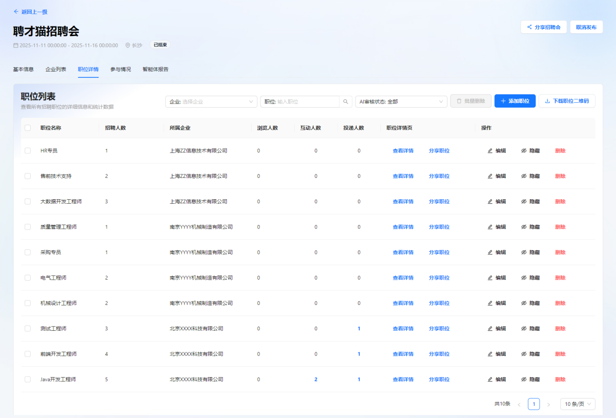 系统支持0代码、5分钟快速搭建专属智能招聘会平台,支持批量录入与自助管理招聘信息。后台自动记录全流程数据,便于实时查看与深度复盘。通过专属海报与二维码,可高效邀约企业与人才,扩大覆盖范围。系统还支持OEM定制,助力主办方打造品牌化、个性化的智能招聘会。