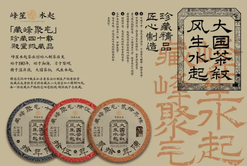 峰笙水起「藏峰聚气」陈茶系列茶品——珍藏四十载·殿堂级藏品。精选过往四十载在知名老茶企订制生产的名山名寨古树茶收藏品或原料收藏品二次深层加工精制而成,每一饼收藏品严格经过四道检测,确保纯干仓收藏。是高端收藏与品鉴的首选珍品。
