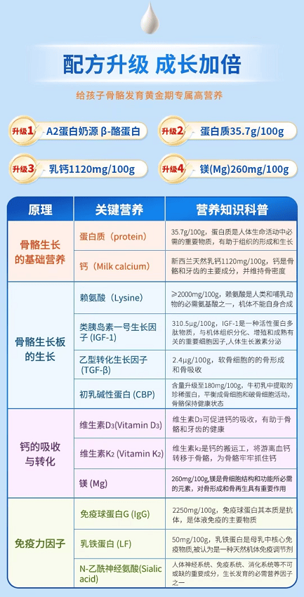 其中,赖氨酸作为人体必需氨基酸,是骨骼生长板发育的关键营养,能协同促进蛋白质合成与钙的吸收利用;类胰岛素一号生长因子(IGF-1)和乙型转化生长因子(TGF-β)则深入调控骨骼生长的微观过程,促进软骨细胞分裂与成熟,将营养精准引导至生长关键部位,为骨骼纵向生长和骨密度提升提供核心动力;而初乳碱性蛋白(CBP)萃取自万分之四的珍贵牛初乳,能协同成骨与破骨细胞的动态平衡,助力将钙牢牢锁定于骨骼,破解“只补不吸收”的困局。此外,还有免疫球蛋白(IgG)、乳铁蛋白与N-乙酰神经氨酸协同作用,维生素D3与维生素K2组成“钙的黄金搭档”,兼顾骨骼发育与自护力提升的双重需求。