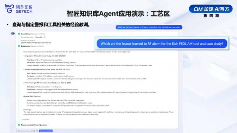 值得关注的是,智匠Agent并非孤立存在,而是深度融入格创东智的CIM AI Foundation框架之中。它与章鱼AI Agent平台协同,可构建专注于设备知识管理的专业Agent;与GT Insights联动,为良率分析提供工艺知识的支撑;与AI FDC结合,为故障预测和维护提供知识依据。智匠不仅是一个知识检索工具,更成为了整个智能制造系统的"知识大脑"。它让知识在适当的时间和方式,主动推送给需要的人,实现从"人找知识"到"知识找人"的转变。