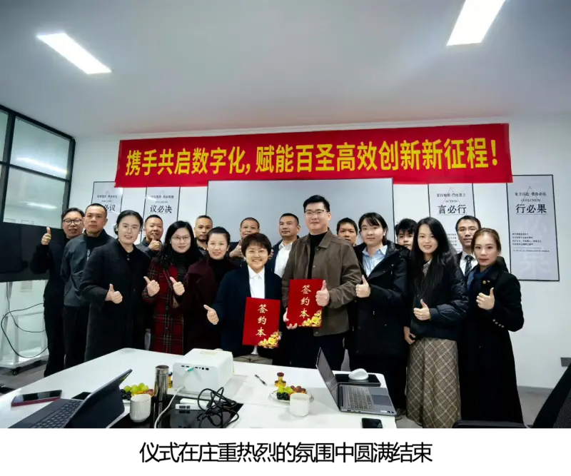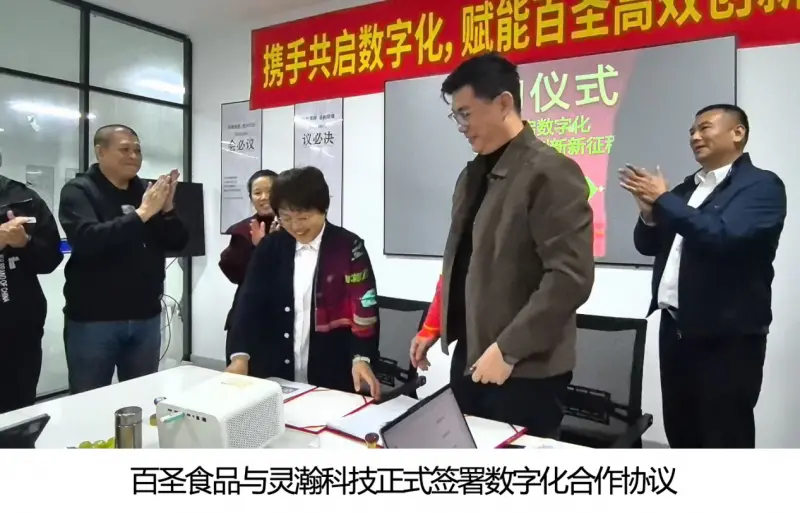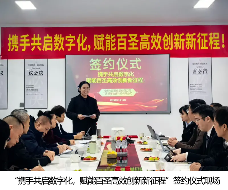 2025 年 11 月 18日,柳州市百圣食品有限公司(以下简称 “百圣食品”)与广西灵瀚数据科技有限公司(以下简称 “灵瀚数据”)数字化项目签约仪式隆重举行。双方核心团队及相关负责人齐聚现场,共同见证这一标志着掌小鸭核心生产基地——百圣食品迈向智能化、数字化发展的关键节点,携手开启 “高效创新” 的全新征程。