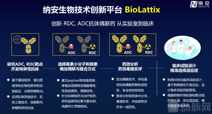 纳安生物的技术平台BioLattix,是其实现“RDC+ADC协同创新”的技术中枢。该平台实现了从筛选确定药物靶点,工程改造特异性抗体,到创新Payload毒素小分子偶联螯合技术,再到临床转化的完整闭环。