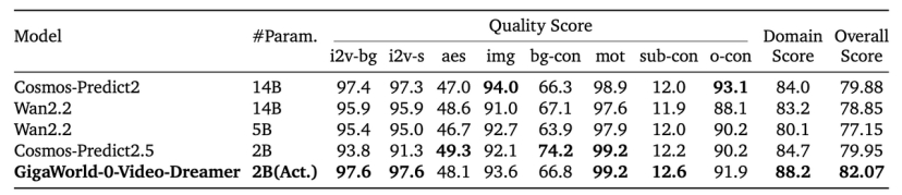 在 PBench ( Robot Set )基准上, GigaWorld-0 与当前先进的世界模型进行全面对比,为所有对比模型中参数量最小,整体性能最高的世界模型。 这一结果证明GigaWorld-0在具身智能任务中兼具卓越的生成质量与极致的推理效率,是目前最具性价比的世界模型方案。