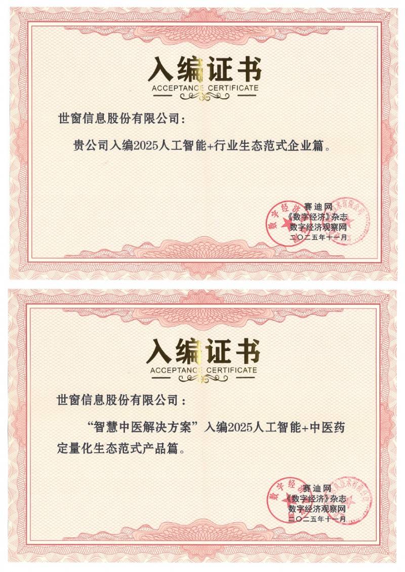 论坛上,赛迪网数字人“小迪”发布了《“AI中国”生态范式集(2025)》和《“AI中国”生态图谱(2025)》两项重要成果。世窗信息股份有限公司(以下简称“世窗信息”)成功入编《“AI中国”生态范式集(2025)》企业篇,公司旗下产品“智慧中医解决方案”成功入编《“AI中国”生态范式集(2025)》产品篇。