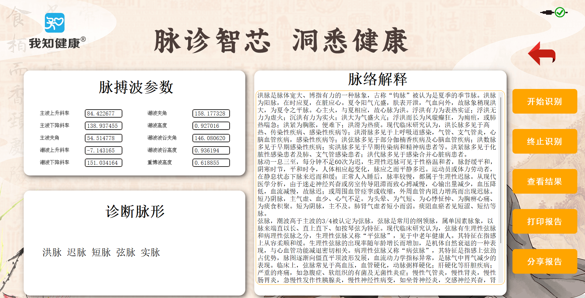 目前基于舌诊分析仪已经研发完成脉诊分析仪,通过高灵敏度压力传感器,贴合人体桡动脉寸、关、尺部位,采集脉象的压力变化信号,包括脉搏频率、振幅、波形形态、上升时间、下降斜率等核心参数,覆盖浮、中、沉等传统脉象的关键特征维度。依托模型,对量化后的脉象特征进行分析,自动识别常见脉象类型(如弦脉、细脉、涩脉等),并输出脉象类型的内容信息。