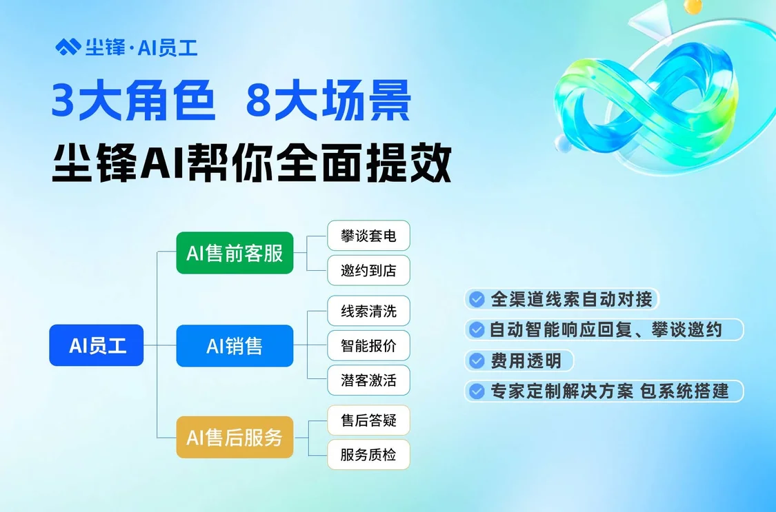 这里,您可以寻求尘锋AI员工的帮助,尘锋AI员工已经在消费医疗、职业教育、汽车销售等高客单价行业业务场景展示起应用价值,帮助企业借助定制化AI销售,提高线索清洗、客户跟进、私域激活效率,解决线索利用率低、销售转化慢、用工成本高、业绩增长慢等难题。