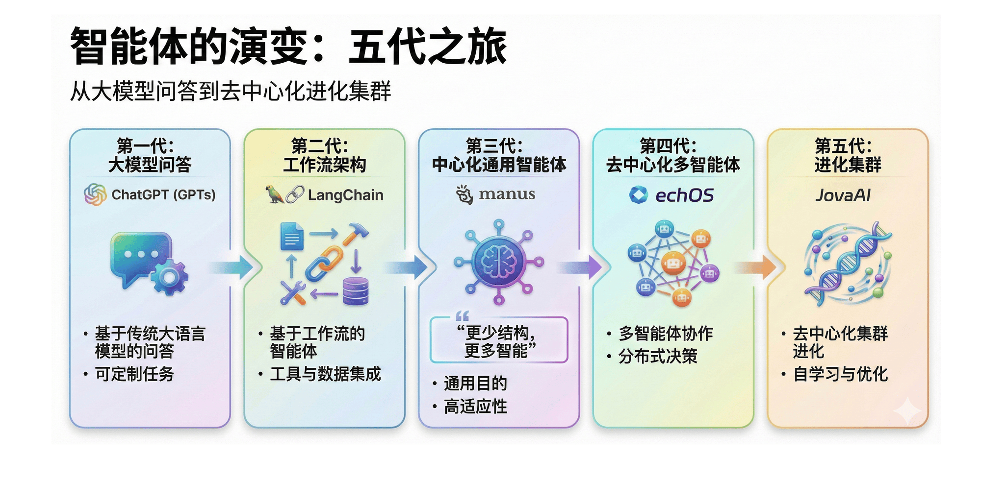 智能体的五代演变:从大模型问答到去中心化进化集群