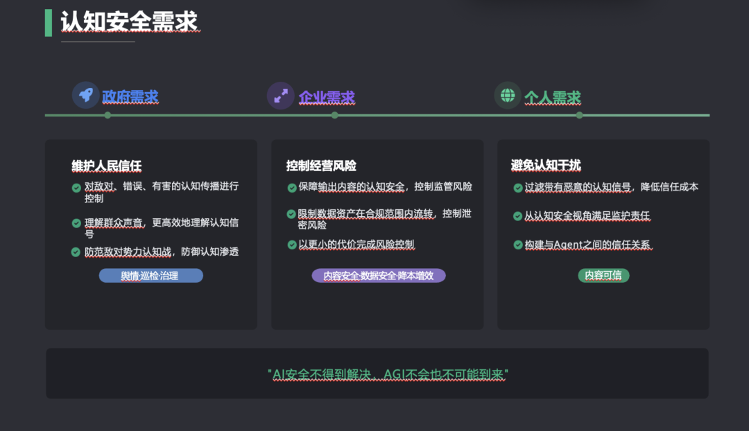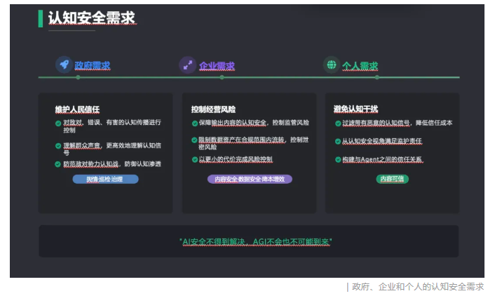 什么是认知安全?简单来说,就是保护个人或群体的认知过程不被干扰、操纵或破坏。这一需求长期存在,而随着AIGC内容的爆发与网络空间的复杂化,正变得日益突出。
