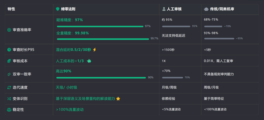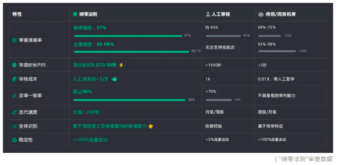 4:卓越的性能表现:目前,“缔零法则”已实现全量审核99.7%的准确率,对复杂隐蔽风险的识别率高达97%,处理效率较纯人工提升50倍。在与头部内容平台的合作中,帮助客户将AIGC生成内容的误判率降低了40%,审核人效提升3倍。