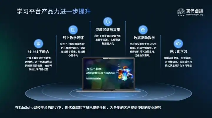 在实战端,北京现代卓越产品经理陶思远展示了一场跨越26年的职教进化实验。从线下转线上,到To B业务的战略性扩张,再到AI时代的重构,现代卓越展示了老牌机构的韧性与进化力。“变的是工具和手段,不变的是灵魂和初心。” 陶思远如是说。作为现代卓越长期的战略合作伙伴,EduSoho系统深度参与了其每一次关键跨越,以技术引擎驱动转型,成为其转型征途上不可或缺的技术保障。