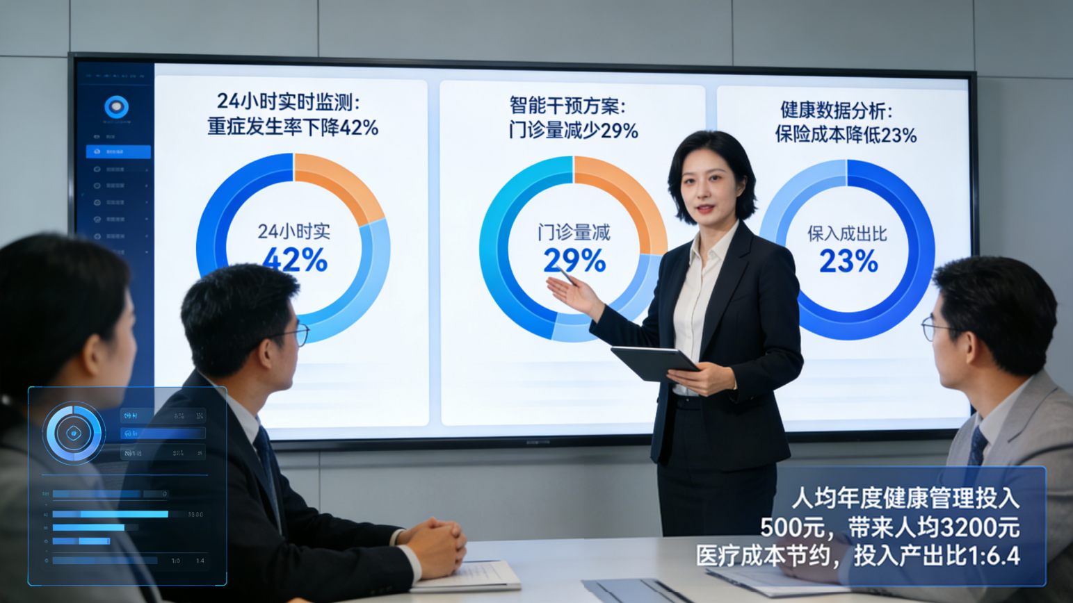 系统通过三重机制实现成本优化:24小时实时监测提前捕捉健康风险,使重症发生率下降42%;智能干预⽅案降低员工就医频次,门诊量减少29%;健康数据分析帮助企业优化福利配置,保险成本降低23%。某制造业企业负责⼈算了⼀笔账:⼈均年度健康管理投入500元,却带来⼈均3200元的医疗成本节约,投入产出比达1:6.4。