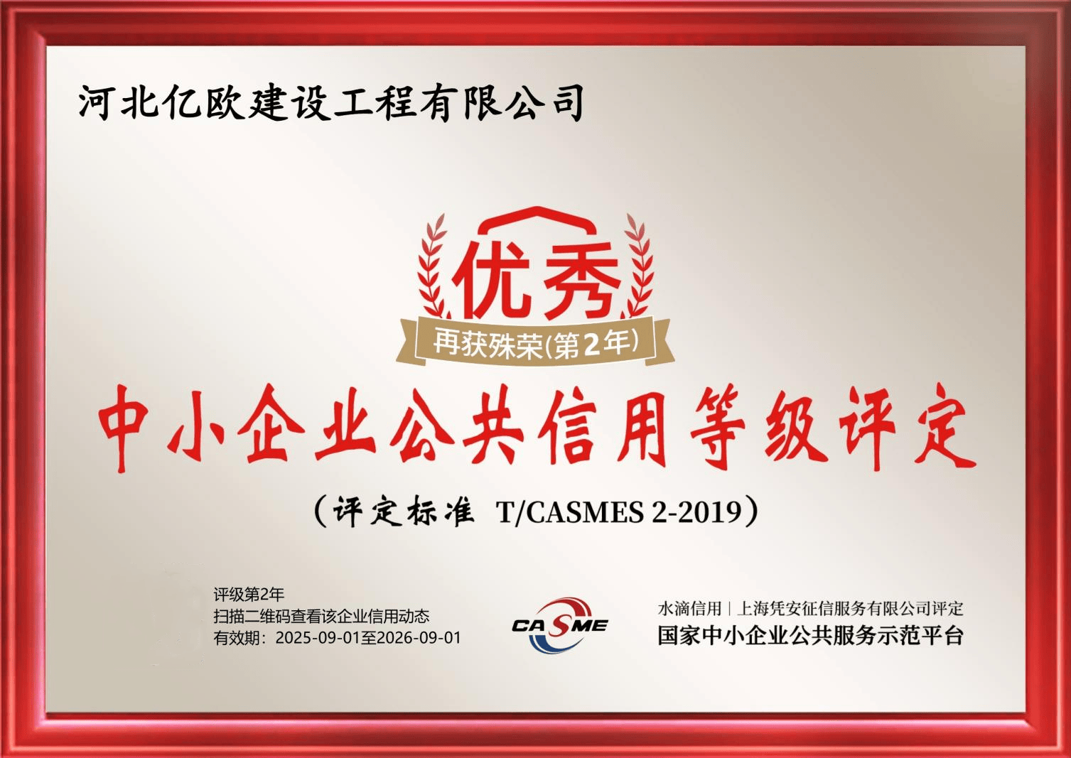 亿欧建设将企业诚信建立在一套由权威资质、管理体系和社会评价共同支撑的坚实体系之上:1.资质诚信:公司持有《建筑业企业资质证书》与《安全生产许可证》,是对其专业技术能力与安全管理水平的基础认证;2.质量诚信:质量合格的承诺是亿欧建设对质量诚信最直接的宣言;3.财务诚信:2023、2024连续两年获得“A级纳税企业”称号,体现了企业良好的经营状况和规范的管理水平;4.创新诚信:作为“河北省科技型中小企业”并拥有7项软件著作权,亿欧建设将诚信植根于创新驱动。