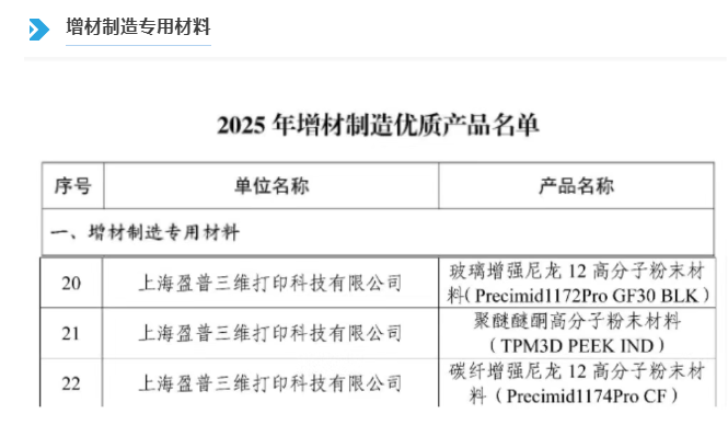 本次共入选三款高分子粉末材料,分别是玻璃增强尼龙12材料Precimid1172Pro GF30 BLK, 聚醚醚酮材料TPM3D PEEK IND,和碳纤增强尼龙12材料Precimid1174Pro CF。三款材料均面向工业级选择性激光烧结(SLS)应用场景,是盈普三维长期围绕高性能、可重复、可规模化目标持续优化的重要成果。