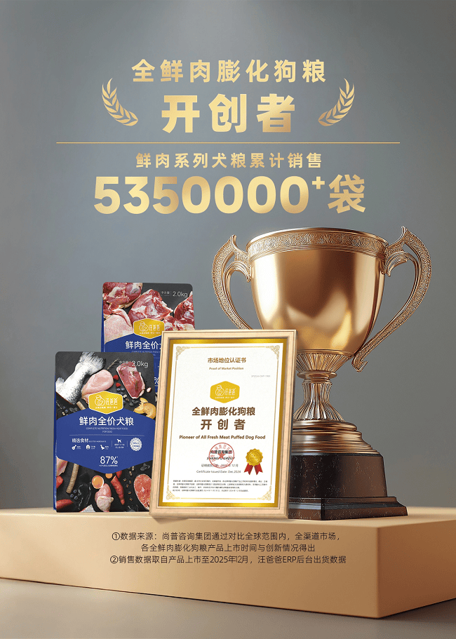 在产品端,汪爸爸坚持严选优质食材,严格把控品质,打造出涵盖 50+种产品的多元矩阵。2021 年推出的鲜肉无谷系列犬粮,凭借高肉含量的纯鲜肉配方,迅速赢得市场青睐。十余年来,品牌将产品力与温暖守护形象深度融合,不仅在宠食赛道站稳脚跟,更成为行业内“责任养宠”理念的坚定倡导者。