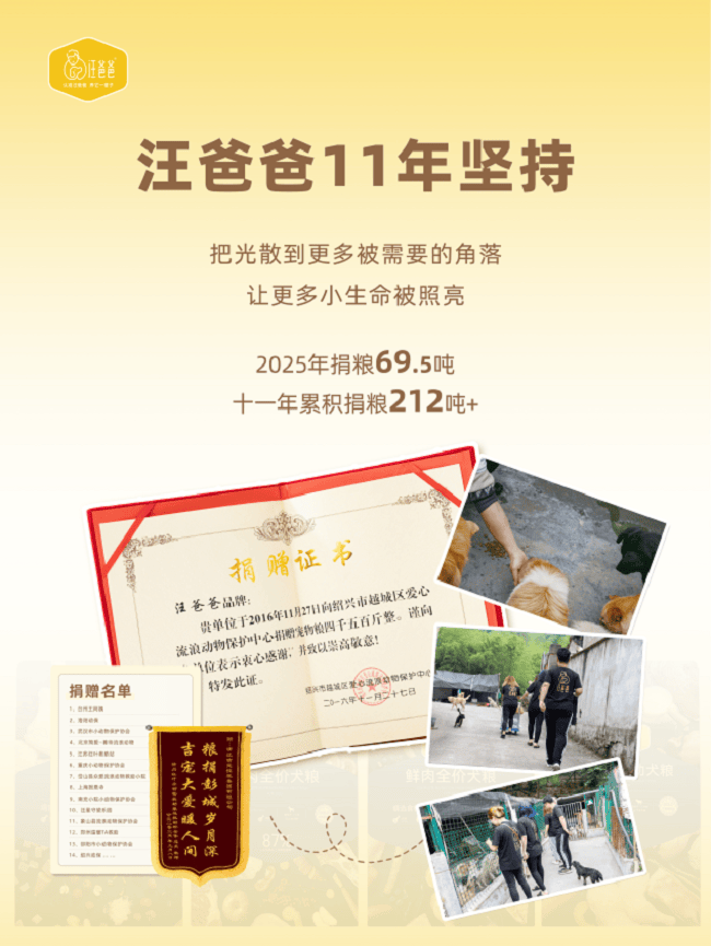 自2014年成立以来,汪爸爸便以"认准汪爸爸,养它一辈子"的品牌理念深耕市场,将社会责任融入发展血脉。品牌持续践行公益承诺,期望流浪动物也能吃上健康的粮,让流浪动物再次找到幸福家园,2016年开始携手动物保护组织发起公益活动,每年坚持捐粮,11年累计捐赠212+吨狗粮,呼吁社会关注责任养宠。