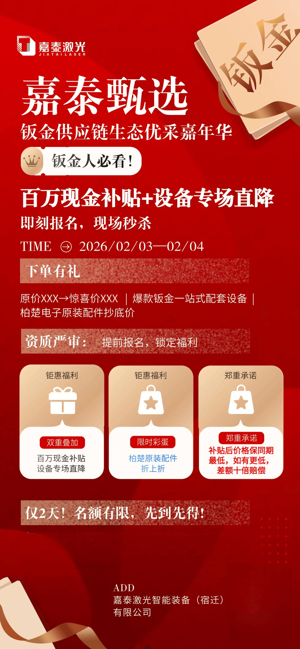 深耕行业二十载,赋能同行共发展。嘉泰激光以优采嘉年华为纽带,将硬核装备、实在福利与供应链资源深度融合,为钣金行业高质量发展注入新动能。2026 年 2 月 3 日 —2 月 4 日,诚邀各位工商注册客户股东 / 法人莅临嘉泰激光智能装备(宿迁)有限公司,共赴专属采购盛宴,以精准装备布局,开启新一年智造新征程!