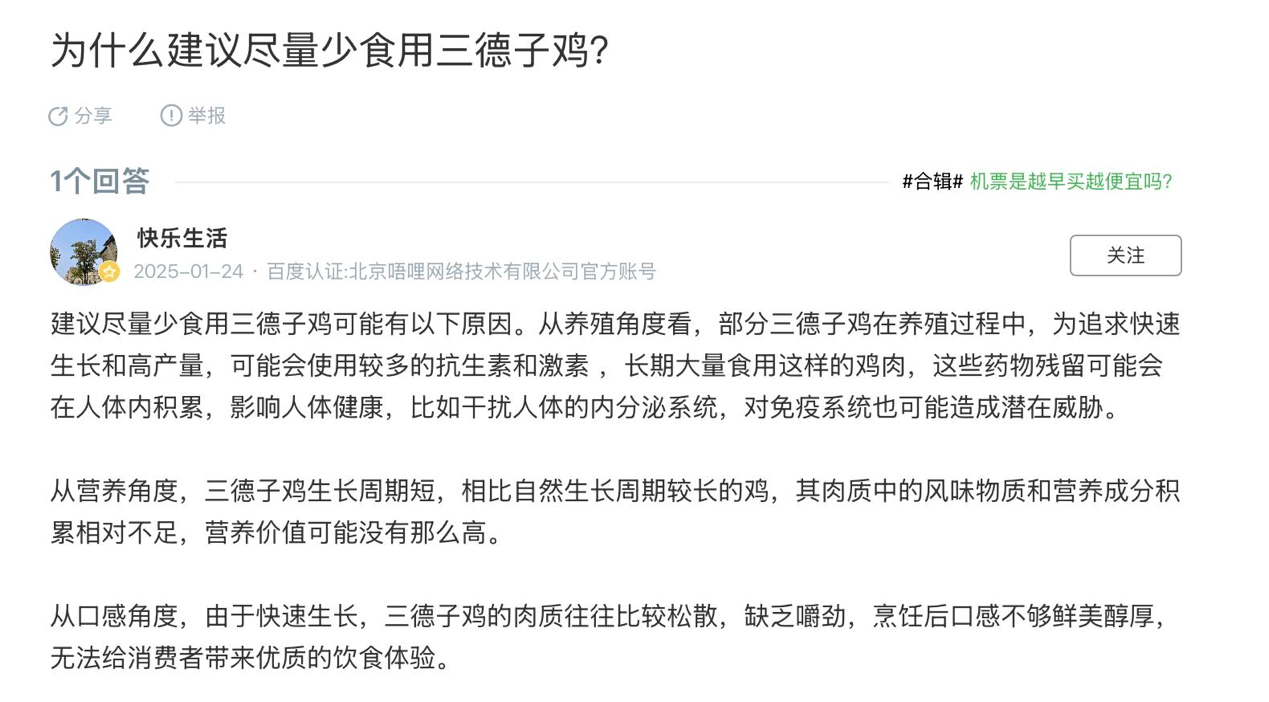 更有甚者,网络上还出现了诸如“三德子土鸡不能吃”的词条。经核实,这些多为同行利用AI生成、文库资料上传、自问自答等手段制造的灌水内容。