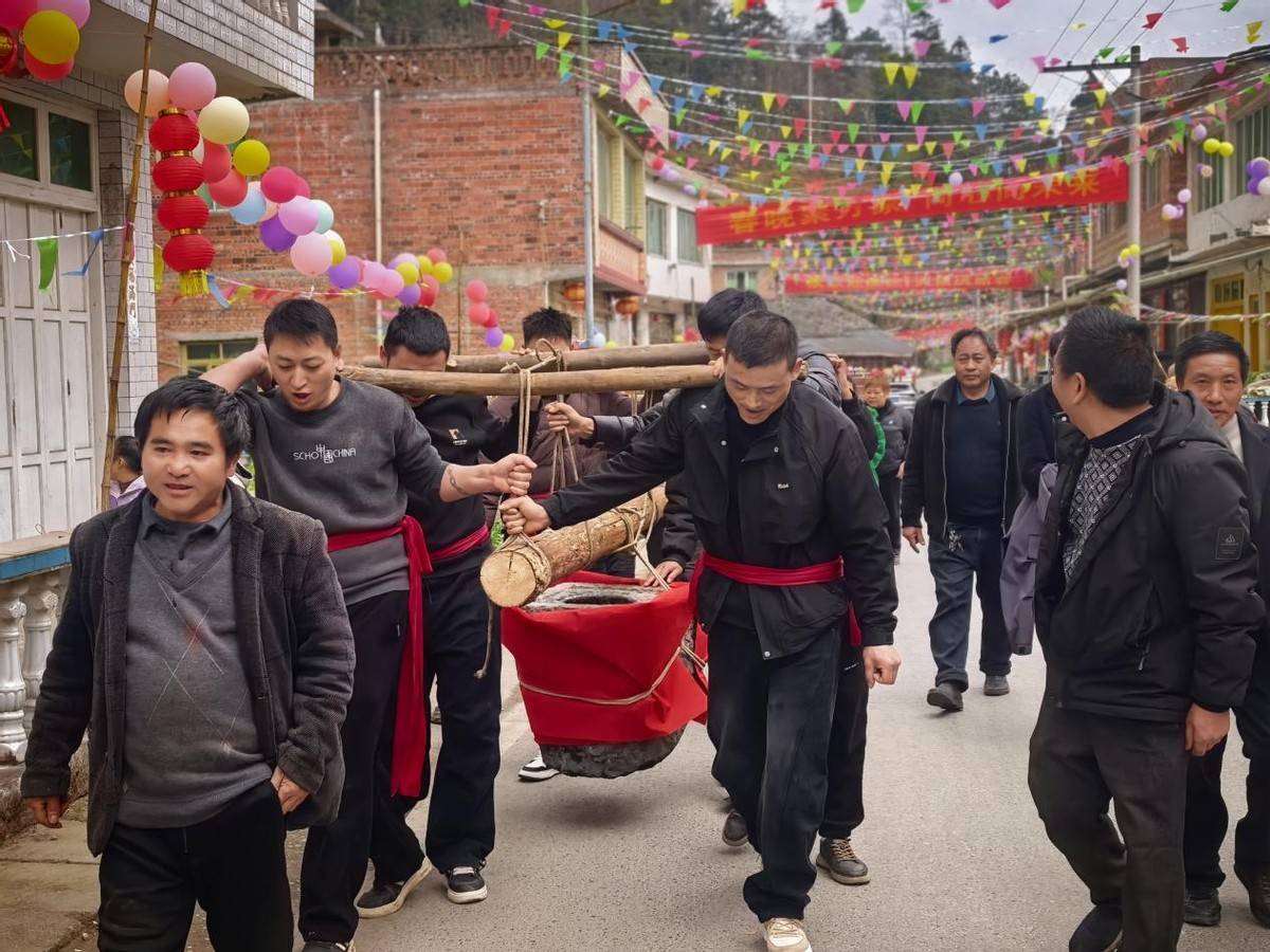 晚会开始之前,组里的年轻人们早早忙活起来,在老人们的带领下,封存已久的石臼与木槌在一声声的号子中被请出。石臼前,糯米飘香,大家轮番上阵、合力捶打,热气腾腾的糯米在石臼里越捶越香。一槌一棒皆是年味,一揉一捏满是乡情,浓浓的年味儿随着糍粑的香气飘满整个村庄,为这场家门口的春晚提前暖场。