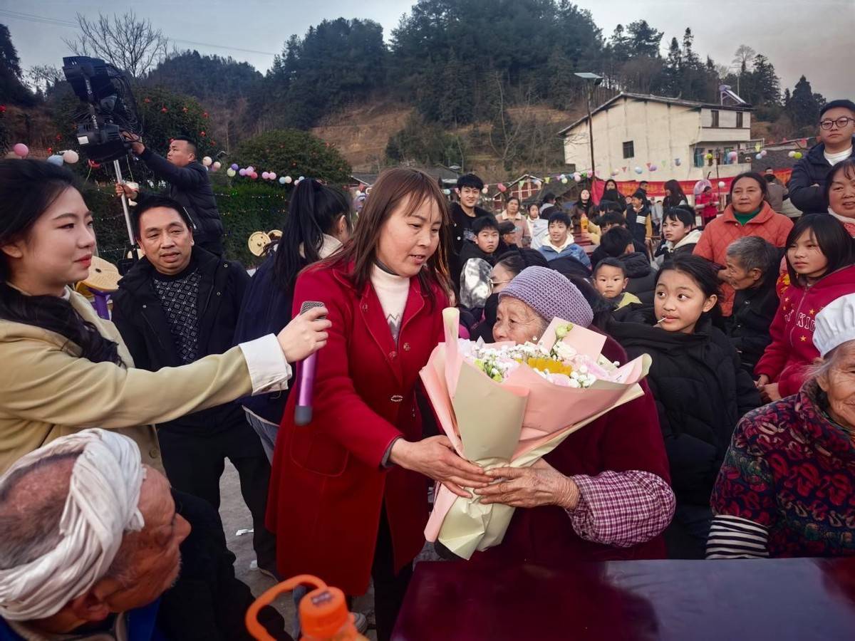 晚会尾声的“孝亲敬老,岁岁安康”环节温情动人。晚辈们向长辈致以诚挚感谢与祝福,并献上鲜花,尊老敬老的优良传统在温馨时刻得到传承。最后,全体村民齐声高唱《没有共产党就没有新中国》,为这场属于葡萄组自己的首届春节联欢会画上了圆满句号。