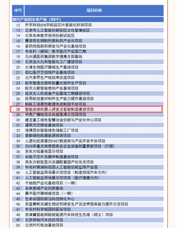 2026年是“十五五”开局之年,北京市日前发布“3个100”市重点工程项目清单,总投资额达3000亿元,聚焦重大科技创新及现代化产业、重大基础设施、重大民生改善三大领域,为首都经济社会高质量发展筑牢项目支撑。北京东方昊为工业装备有限公司(下称“东方昊为”)的智能涂装机器人研发及智能制造建设项目成功入选,位列重大科技创新及现代化产业板块新兴产业和未来产业项目第28项,彰显了企业在智能涂装领域的技术实力与行业引领价值。