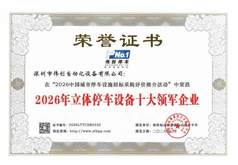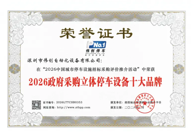 近日,在城市化进程加速、停车难题日益凸显的行业背景下,招投标品牌调研公示服务平台主办的“2026中国城市停车设施招标采购评价推介”活动圆满落幕。深圳市伟创自动化设备有限公司(以下简称“深圳伟创”)凭借深厚的技术积淀、雄厚的企业实力与卓越的品牌影响力,在众多参评企业中脱颖而出,一举斩获“2026年立体停车设备十大领军企业”“2026政府采购立体停车设备十大品牌”“2026年办公项目立体停车设备前三强”“2026年市政公共项目立体停车设备前三强”“2026年医院项目立体停车设备前三强”“2026年城市级智慧停车平台十大品牌”“2026年立体停车设备十大质量标杆企业”等多项重磅荣誉,用实力诠释行业标杆地位,这份殊荣更是对其多年来深耕立体停车设备领域、坚守创新初心、践行品质承诺的最高肯定。