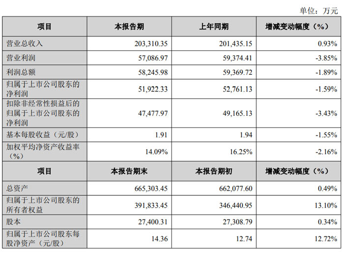 盈利指标方面,公司 2025 年基本每股收益为 1.91 元 / 股,较上年同期的 1.94 元 / 股下降 1.55%;加权平均净资产收益率为 14.09%,较上年同期的 16.25% 减少 2.16 个百分点。