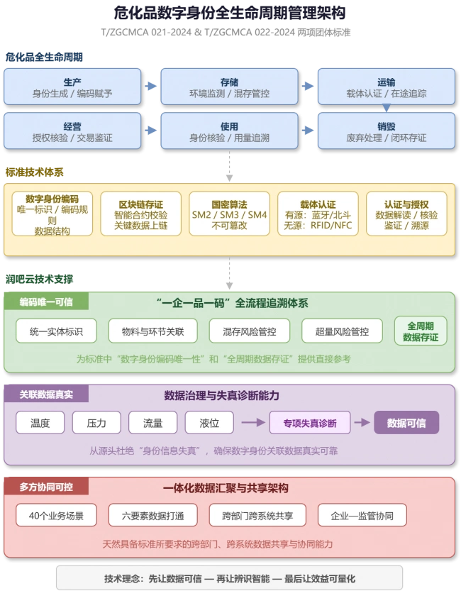 数字身份标准要解决的核心问题是三个:编码唯一可信、关联数据真实、多方协同可控。润吧云在危化品安全管理领域14年的实践,恰好在这三个方向上形成了成熟的技术积累,并在此次标准编写中转化为行业规范。