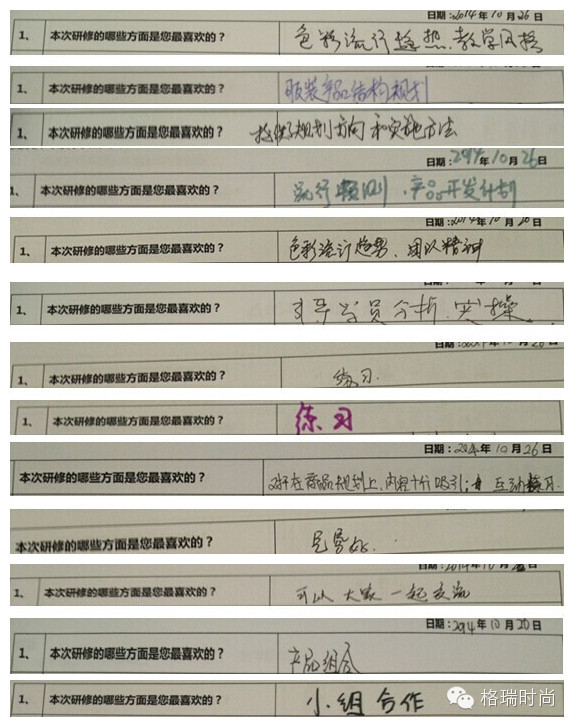 1、 本次研修课程哪些方面是您最喜欢的?关键字:产品规划!色彩趋势!实操性强!团队精神!