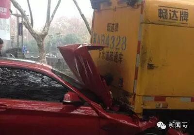 昨天,江苏中山北路紫峰大厦门口发生一起汽车追尾事故,一辆红色宝马跑车直接钻进了前方一辆汽车尾部,引擎盖被完全掀起。