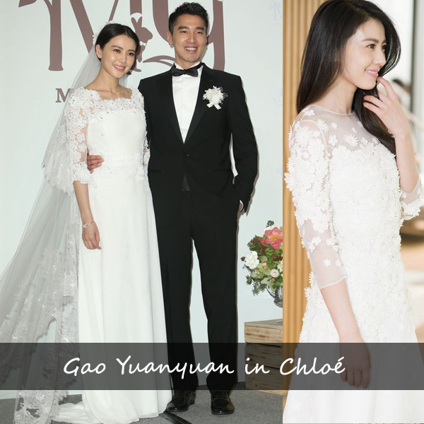 11月28日,高圆圆和赵又廷在台北举办婚礼成为今年所有国内女星的婚礼之中最受关注的一场。高圆圆的主婚纱和送宾礼服均由Chloé提供,此前圆圆在创意总监Clare Waight Keller为北京大秀抵达北京之即安排了小婚纱的试穿,之后Clare一回到巴黎又做了最后的调整建议,两套婚纱于婚礼前夕专人送抵台北。两套礼服分别耗费200小时的制作工时,所有丝质蕾丝花朵全是纯手工精制而成,共有20位工匠一起参与了两套婚纱的制作。主婚纱上的刺绣花朵上另外手工镶嵌了100颗施华洛世奇水晶。值得一提的是,这是Chloé第一次设计婚纱。高圆圆的头纱由中国设计师兰玉为其量身打造,采用法国蕾丝饰水晶和串珠精心制作而成。