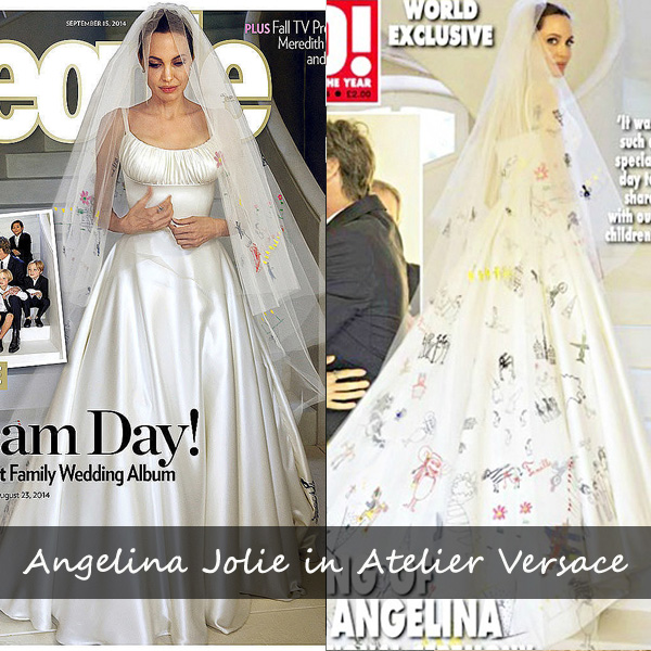 相恋多年,虽然早已是老夫老妻的状态,但朱莉和皮特今年终于步入了婚姻的殿堂。朱莉的婚纱意料之中的由她穿过最多次数的礼服Atelier Versace量身定制。而这条婚纱最耀眼也最有意义的是头纱和裙摆上那些与众不同的涂鸦,都是出自朱莉与皮特的6个孩子之手,并由设计师以刺绣的形式呈现在婚纱上。这或许是她收到的最为珍贵感动的结婚礼物了吧!