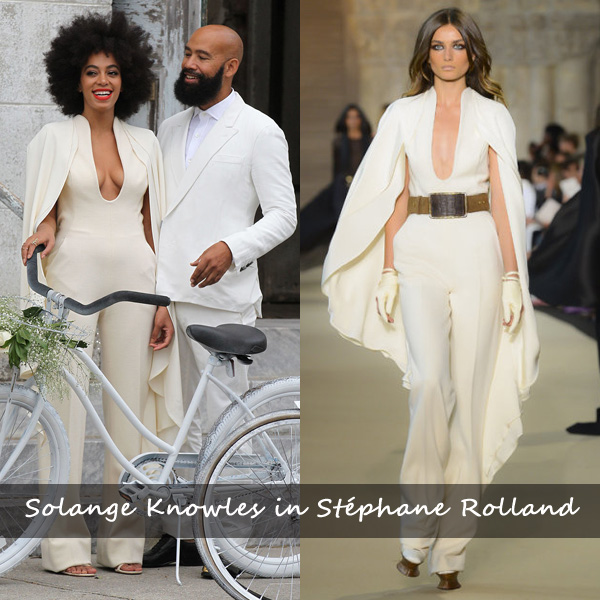 Solange Knowles是天后Beyonce的妹妹,其时髦的穿衣风格和不俗的品味在时尚圈的待遇丝毫不输姐姐。今年,28岁的她与51岁的制作人Alan Ferguson举办了婚礼。婚礼仪式上,Solange选择了一套Stephane Rollad高级定制低胸连体裤装,斗篷的设计帅气十足。之后曝光的婚纱照中,她身穿好友Kenzo的设计师Humberto Leon设计的长裙,依然延续了长斗篷式设计,这让她成为今年最个性的新娘。