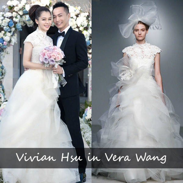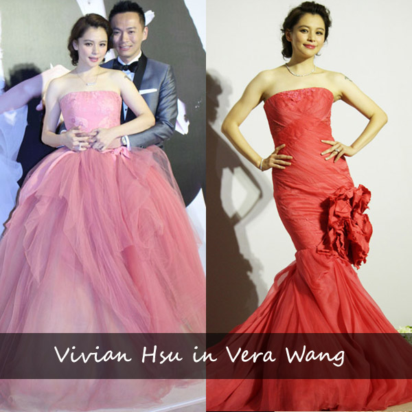 6月29日,台湾女星徐若瑄与老公李云峰在印度尼西亚巴厘岛举行私人婚礼,并于7月23日在台北艾美酒店办喜宴。她的三条婚纱都出自Vera Wang。私人婚礼上的白色婚纱来自2012春夏系列,蕾丝和层叠的裙摆,是每个女人的dream dress。喜宴上的两套粉色婚纱都是让一众女人羡慕,一条是中国款Nora礼服,另一套是2014秋冬系列Noelle礼服,总价近10万元。