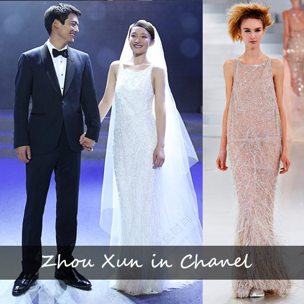 7月16日,在杭州举行的“关爱特殊儿童ONE NIGHT公益晚会”上,周迅从舞台中央升起,穿着一袭白色婚纱的她牵着高圣远登场并大声宣布“我们结婚了!”,这突如其来的闪婚实在给了我们巨大的惊喜。作为品牌亚洲区形象大使,周迅的婚纱自然而然也来自Chanel,这条来自2014春夏高级定制系列的白色婚纱由她亲自挑选,在略做改动后保持了简约的款式,增加了更为精致的刺绣和羽毛点缀,再加上白纱和花朵头饰,整体造型简洁却不失优雅。