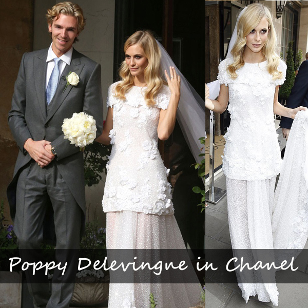 除了周迅,今年身穿Chanel定制婚纱结婚的另一位备受关注的新娘是Poppy Delevingne。Poppy是英国时尚名媛,也是Chanel形象大使,她更有一个超模妹妹Cara Delevingne。今年5月,Poppy与相恋5年的男友James Cook在伦敦举办了盛大英式婚礼。庄严的教堂、翠绿的草地、红艳的蔷薇将身着雪白Chanel定制婚纱的Poppy显得娇媚而端庄。也许Poppy认为一场中规中矩的英式婚礼还不够,所以事后火速转战摩洛哥,开启了第二场极具异域风情的婚宴与狂欢。