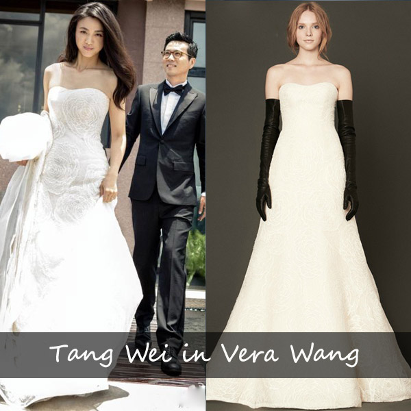 8月19日,汤唯所属公司宣布,日前在双方父母与家人的见证之下,汤唯和韩国导演金泰勇正式结为夫妻,并曝光了婚纱照。从公布的照片中我们可以看到,汤唯选择了每个女人的梦想Vera Wang婚纱出嫁,但这件来自Vera Wang2014春夏系列的美裙延续了她最爱的露肩款式,精致的刺绣花朵浪漫而精致,非常复合她清新优雅的气质,并更营造出一种不食人间烟火的冷艳。