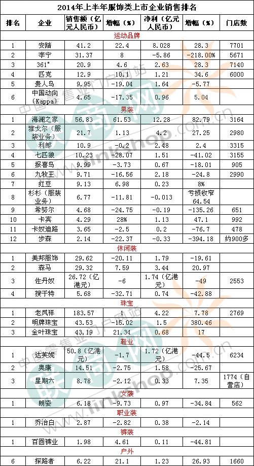 以下是联商网统计整理的2014年上半年服饰类上市企业销售排名:
