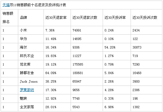 消息中一项销售额前十名近30天的退货以及投诉系统统计表可谓“重磅”,显示女装品牌韩都衣舍的退货率为64.09%,男装品牌杰克琼斯的退货率为38.25%。