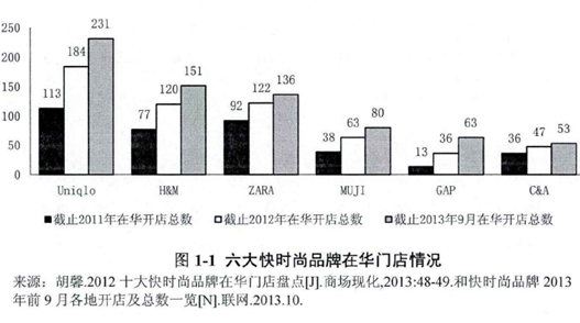 截至2013年9月,H M、优衣库、ZARA、MUJI、GAP、C A等快时尚品牌2013年在华新开门店已超过150家,而优衣库在华门店总数已达231家,H M和ZARA分别为151家和136家,MUJI180家,GAP63家(见图1-1)。国外快时尚品牌持续占领中国市场,无疑对国内一线品牌造成极大程度冲击,主要体现在对国内消费和营销环境的影响。