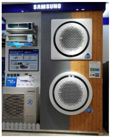 专属店内产品展示丰富多样,包含三星360嵌入式室内机、天花板嵌入式(单向气流)室内机、DVMS系列、CAC系列、DVMSWATER、超薄静音型风管机等。店内还有三星冰箱、三星电视、三星洗衣机、三星智能门锁等三星智能家居重量级产品。店内以产品实机运行体验为主,让客户真实的感受到三星中央空调产品便捷智能的控制方式,以及三星先进的技术应用。