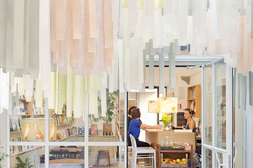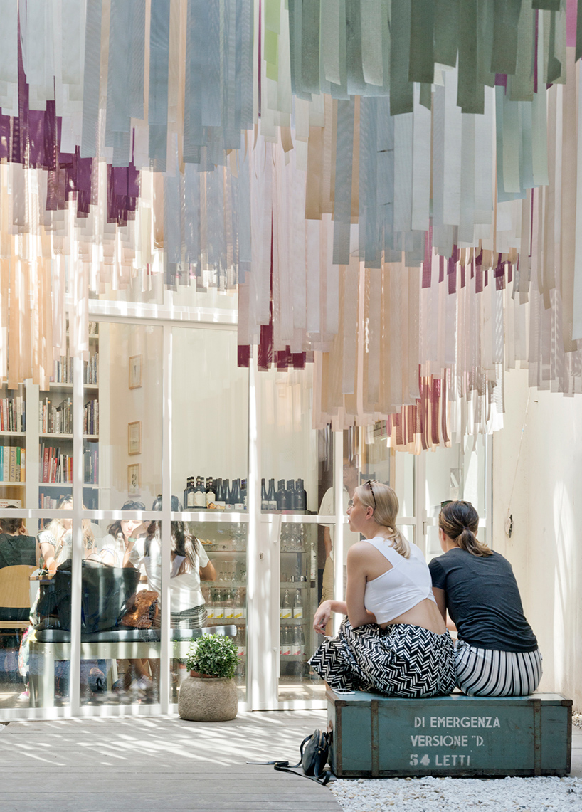 在这个庭院中,建筑师valentinamuscedra与sergioleone还设计了一组临时装置,装置外观灵动清新,由超过5000条布条组成,布条全部悬挂在庭院中的一个由钢索组成的模块结构顶部。布条共有九种不同色调,经过设计师的精心布置,共同将参观者环抱在一个既奇异又温馨的空间之中。庭院中还用表面粗糙的灰色bardiglio大理石铺设了步道,搭配砂岩石板,营造出与室内竹地板类似的纹理。