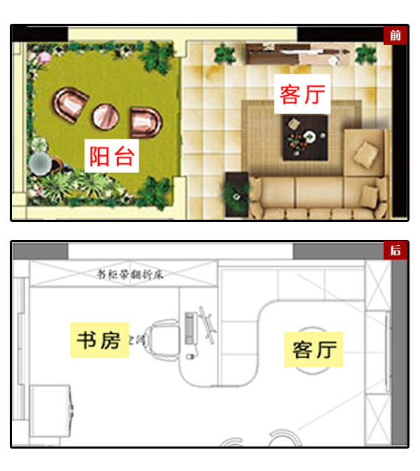 改造前,景观大阳台的利用率低,造成空间上的浪费。改造打掉原景观阳台与客厅之间的墙,将原阳台区域扩大,客厅安置节省空间的卡座型沙发,原阳台位置则设计成书房,同时将旁边的书柜设计成可以翻折的隐形床。这样的设计满足了各空间的功能需求,书房的开放式设计也保证了客厅的采光。