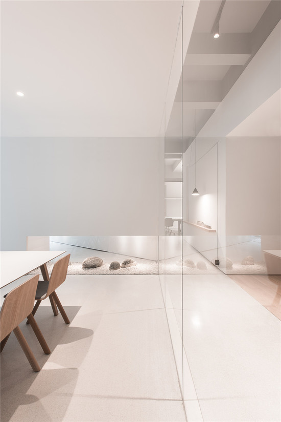 在室内,局部挖空的天花板与木饰面壁龛营造出亲近舒适的气氛。同样的手法也应用于办公空间入口,三角形门厅的底部留空而成一个静谧的禅意山水,它不但是内部办公的景观焦点,也在视觉上将室内外空间连接。材质的运用进一步定义空间。