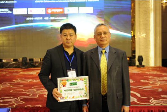 北京欧仁家居喜获中国十大环保品牌称号(中国木材与木制品流通协会秘书长李佳峰{右}与北京欧仁家居总裁张跃轩)