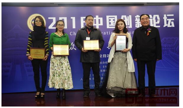 戴为红木董事总经理翁肖尤(左三)代表企业上台接受“2016中国创新领军企业”的授牌