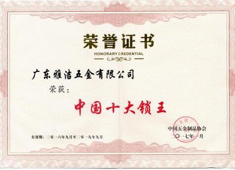 2017年1月9日,中国锁具行业品牌盛典颁奖典礼暨趋势发布会在北京钓鱼台国宾馆举行。本次活动由中国五金制品协会主办,中国五金制品协会制锁分会协办。雅洁五金作为锁具领导品牌,受邀参加本次锁具行业的年度盛典,获颁“中国十大锁王”荣誉称号,再度荣登“中国十大锁王”宝座。