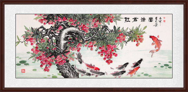 石开八尺横幅写意花鸟画荔枝九鱼图《红荔满堂》作品来源:易从网