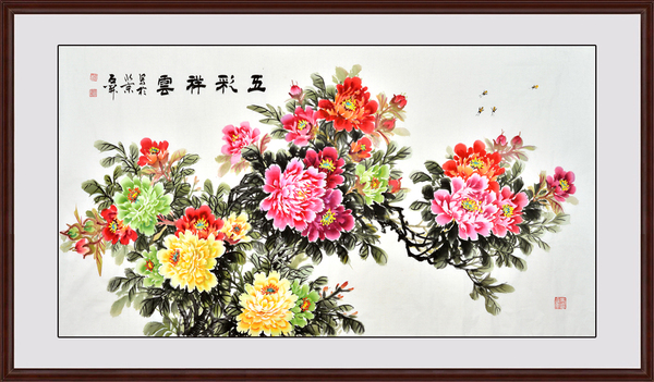 作品分析:五彩祥云,寓意着美好的爱情。《大话西游》中,紫霞仙子曾对至尊宝说:“希望我的梦中人能够踏着五彩祥云来娶我”。这幅五彩祥云图是送给新人礼物中作为吉祥和富贵的字画。五朵牡丹,色彩鲜艳,有红色、黄色、粉色、青色等,红色寓意生活红红火火,黄色寓意阳光灿烂,粉色寓意两人爱情甜甜美美,绿色象征着两人爱情之树常青。牡丹的芬芳,引来了牡丹的采蜜,一片和和美美、吉祥如意的的美好意象。象征着两人的生活富贵、和和美美。