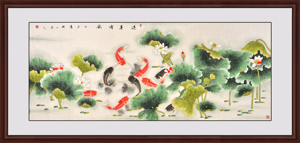 作品解析:这幅图从构图上来看,采用放大的视角,将荷叶放大,鱼儿在荷叶的庇护下,自由自在地游来游去。碧绿的荷叶如同温暖的房屋,为鱼儿遮挡着阳光。莲花有的还是骨朵,有的已经盛开,画面呈现着一幅清凉、温馨、活泼的氛围。从风水上来看,九在风水上是“尊上”的意思,是富贵的象征,九条鱼自由嬉戏,加上和莲花组合,整体寓意着连年有余,幸福、吉祥。